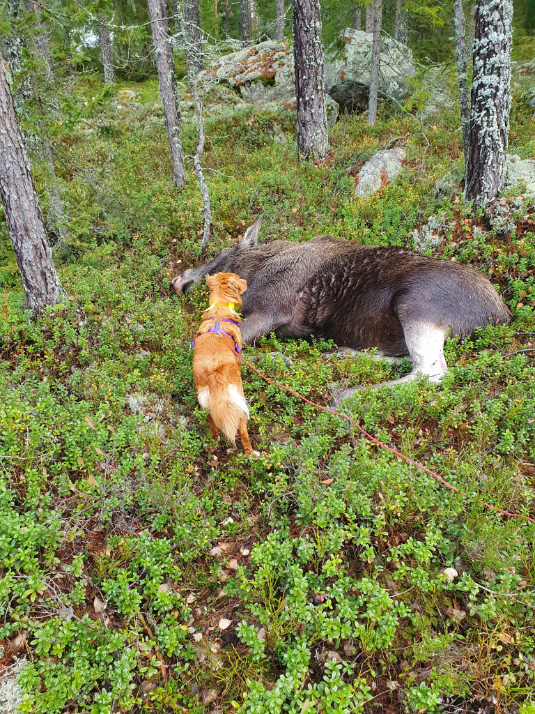 I våras lyckades jag meritera Akka som viltspårchampion. Hon hade väldigt lätt för sig i spårskogen och under älgjakten fick hon tillfälle att prova sina kunskaper i praktiken då husse sköt en älg som försvann en bit in i skogen innan den ramlade. Under skottplatsundersökningen satt Akka tyst och verkade nästan ointresserad. Men direkt jag satte henne på spåret började hon jobba koncentrerat och med ett behagligt tempo nosade hon sig fram markerande alla blodstänk. Efter några hundra meter låg älgen död i lingonriset. Någon minut undersökte hon den men satte sig sen lugnt och tittade förundrad på när gråhunden Blixten slet i älgraggen så tussarna rök. Hoppas vi får göra fler eftersök för det här gav mersmak.