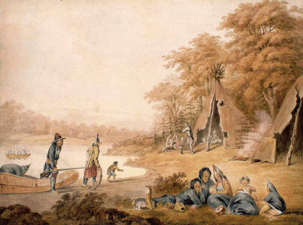 Här är det fullt med rävlika hundar som det säkert skulle fungera att tolla med. Två stycken ligger utanför wigwamen och en som apporterar en gås i nederkant på bilden. I den främre kanoten sitter en hund bakom kvinnan och i kanoten med seglet sitter en liten valp till höger om lindebarnet.