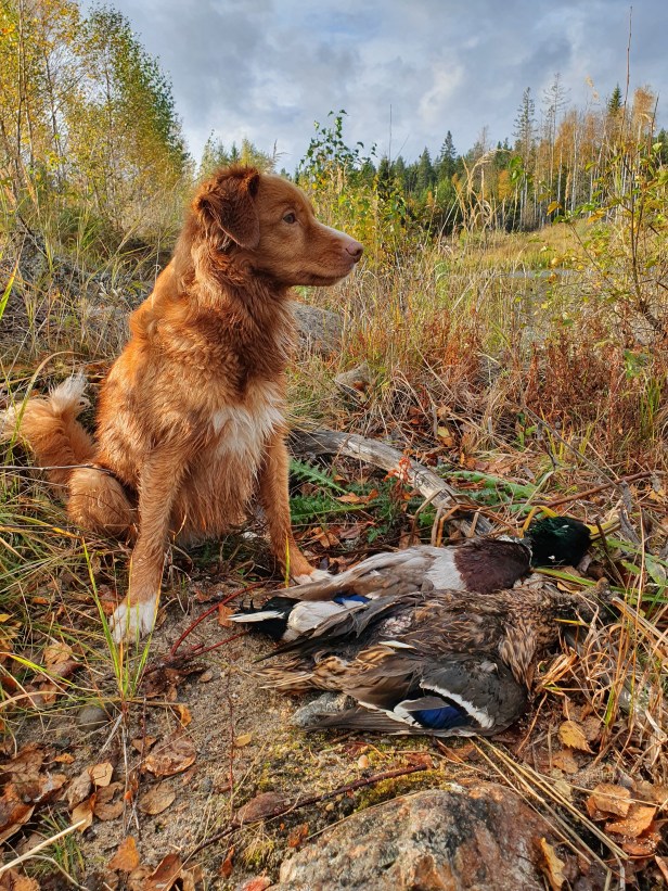 Min nuvarande tollare, Akka, ligger nånstans mittemellan de två första. Hon är väldigt jaktintresserad och vill gärna ta egna initiativ och hoppa över tollingen. Det parerar jag genom att ha henne i en lång lina när jag tollar och det känns som det börjar sjunka in att hon ska tolla innan det blir några fåglar att hämta. Akka är inte speciellt lekfull och det tror jag spelar roll när hon vill prioritera bort tollingen under jakten.