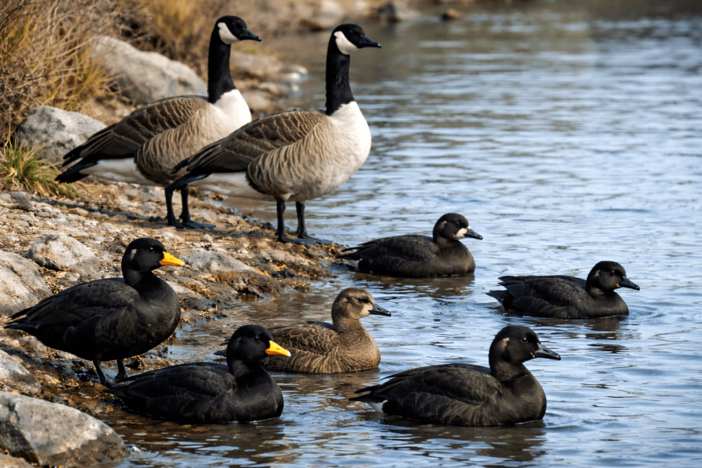 En stor flock svartänder betade högljutt framför mig, men när floden kom inom cirka sjuttiofem yards från mitt gömsle bestämde de sig att inte komma närmare. När saltvattnet hade nått ungefär fyrtiofem yards från min position bestämde jag mig för att börja locka på dem.